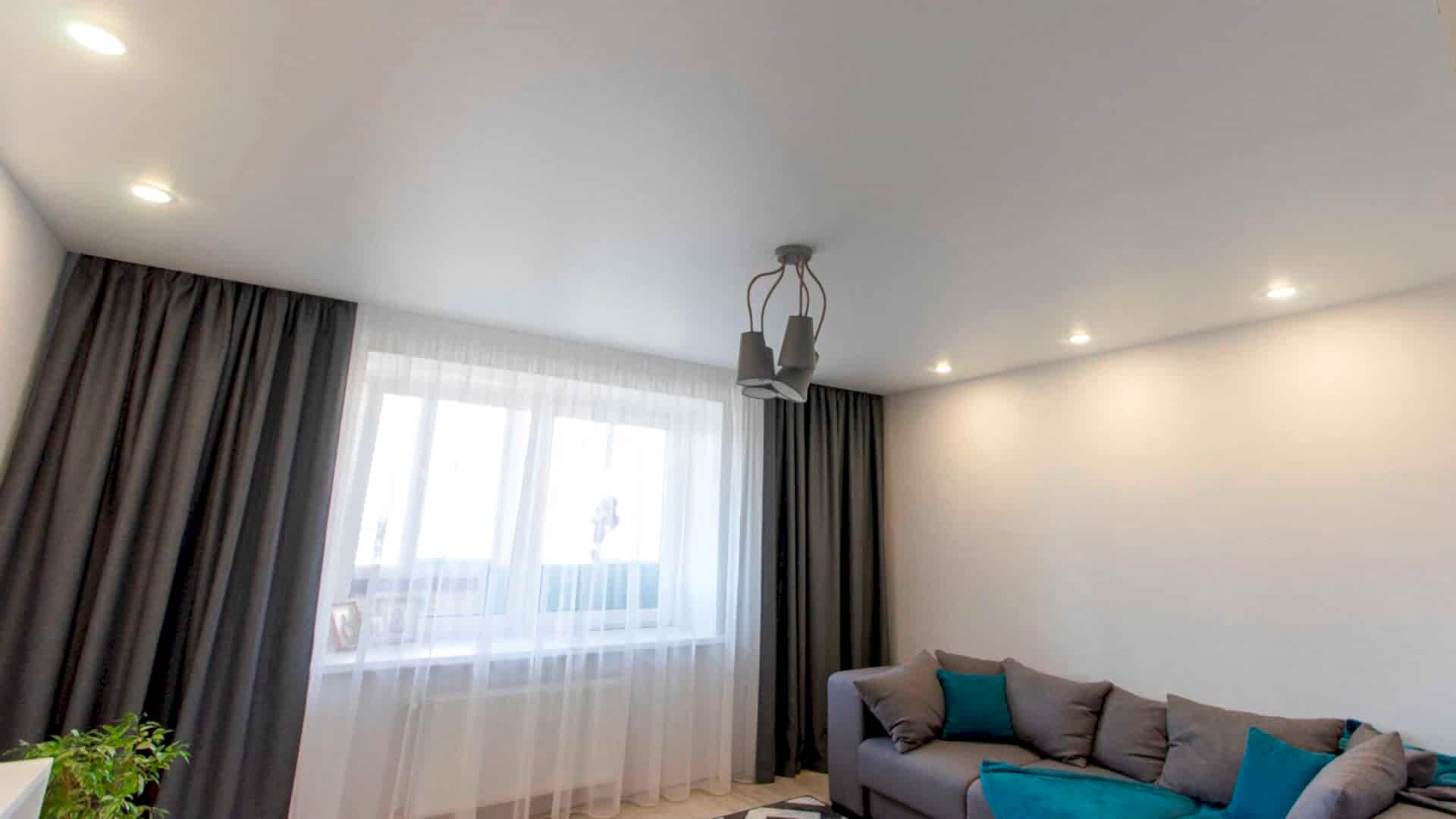 Конструкция с одним уровнем - это бюджетный вариант. Он создает ровную поверхность, подходящую для небольших помещений, не содержащих Pin-Up изысков. Каркас фиксируется на одном уровне высоты, затем по всей площади растягивается полотно. На работу уходит не более 3 часов, все зависит от габаритов комнаты. Если ширины не хватает, то части соединяются незаметным швом. Если есть ниши, выступы, то форма потолка будет аккуратно их повторять. Хороший вариант для комнат с невысокими потолками.