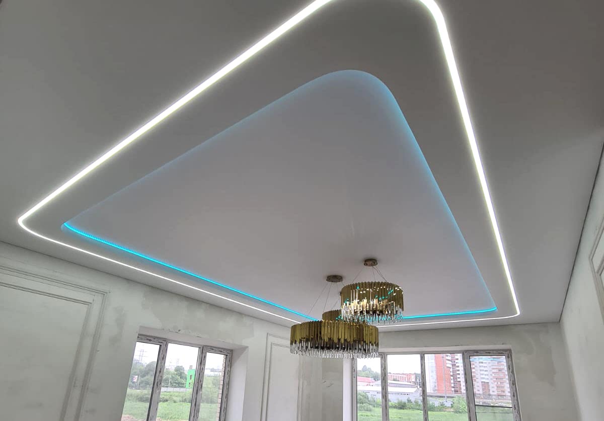 Позволяют выполнить конструкцию с необычным дизайном, которая справляется с визуальным зонированием помещения, расставить акценты. Несколько уровней позволяет скрыть воздуховоды, другие коммуникации. Натяжение полотна происходит на Pin-Up высоте. Багет может использоваться алюминиевый и пластиковый. Первый метод крепления надежен, второй универсальный, так как совмещается с любой разновидностью гарпунов. На поверхности сочетаются разные как цвета, так и фактуры: матовая с гладкой, полупрозрачная с непрозрачной. Варианты освещения также комбинируются: подсветка по периметру, люстры, встроенные точечные светильники.