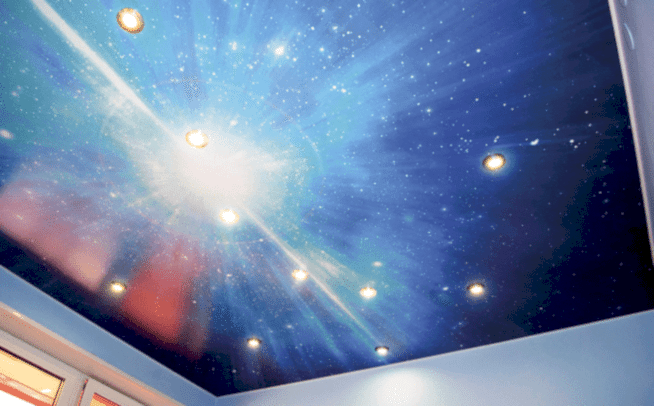 Натяжной потолок «Звездное небо» - это создание романтической атмосферы, воплощение сказки в реальность. Волоконно-оптическая система освещения на потолке позволяет применить Pin-Up рисунки. Профессионально установленный потолок отлично смотрится и не теряет идеального вида долгие годы, приносит настоящее эстетическое удовольствие.