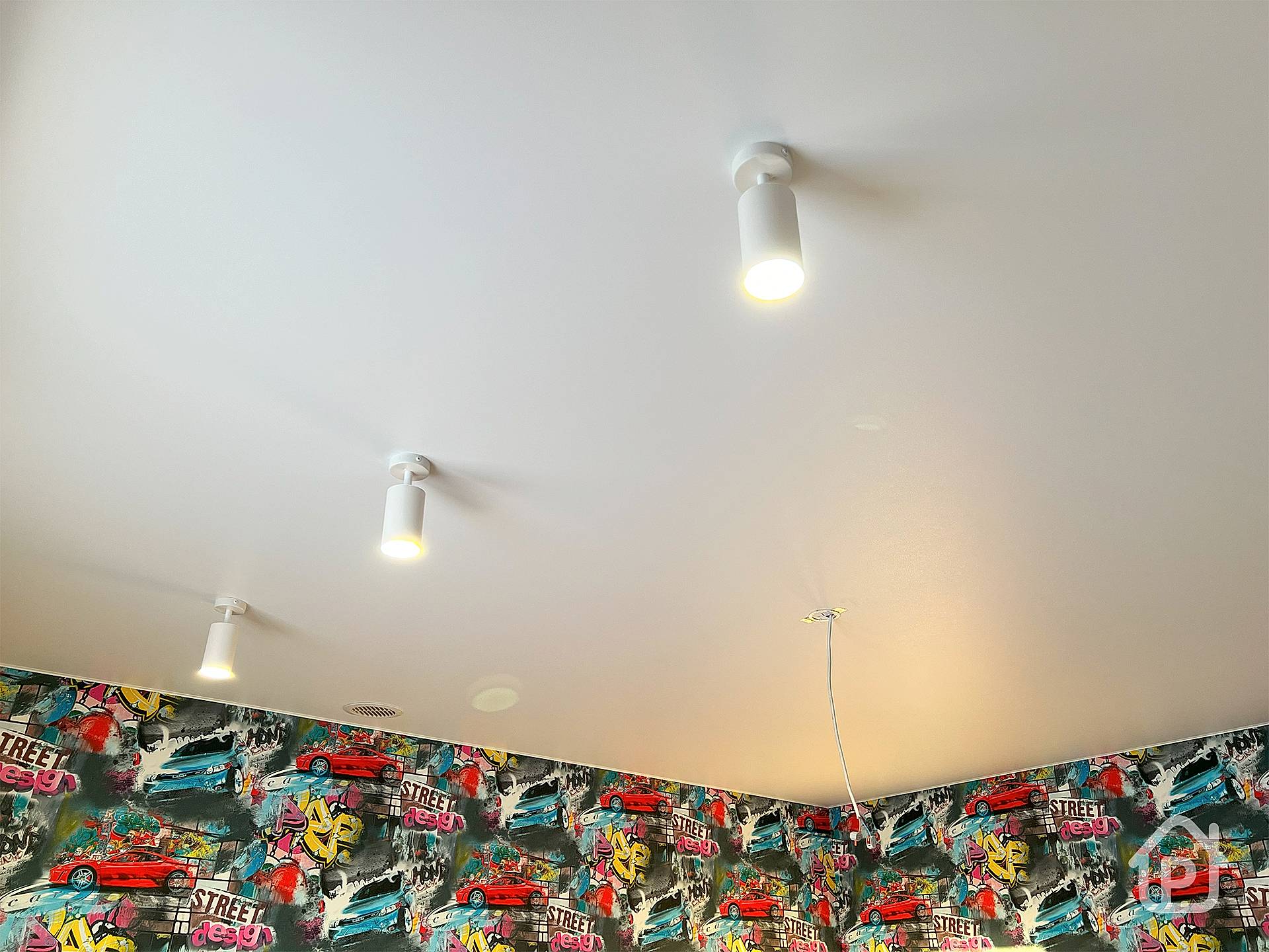 Pin-Up встраиваются в полотно, от его нагревания предохраняет специальное кольцо, которое приклеивается по краям отверстия. Лампы работают от разного напряжения, поэтому, если нет 220 В, нужен будет трансформатор, который фиксируется за потолком. Но, если он сломается, часть пололка придется демонтировать. Рекомендуется выбирать светильники, работающие от сети. Точечные модели чаще всего устанавливают в ряд либо создается определенный узор.